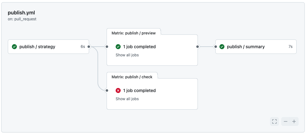 When set up for a monorepo (i.e. there is more than one submission in the GitHub repository), then the publish job will create an action workflow with 4 steps: (1) a strategy, which determines what actions should be run; (2) a preview which will post the submission to Curvenote as a draft or part of an ongoing submission; (3) a local check job that validates each submission against the venues criteria; and (4) a summary job that posts information back to the GitHub pull request.