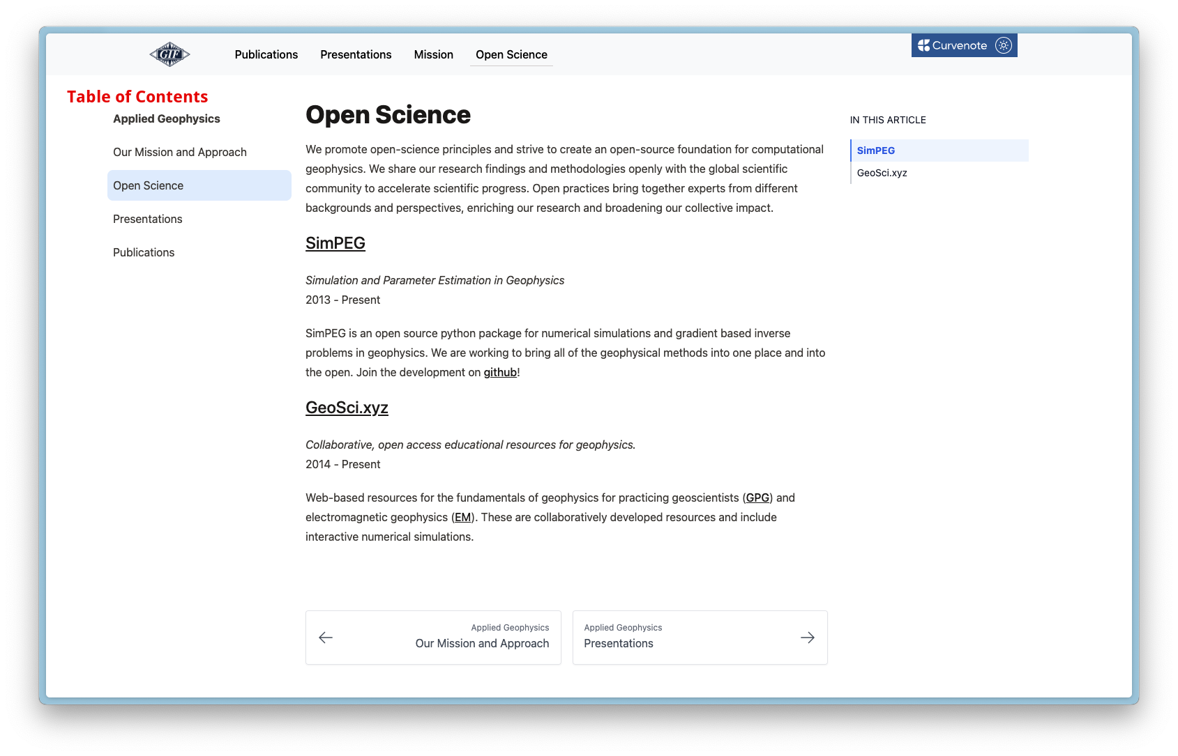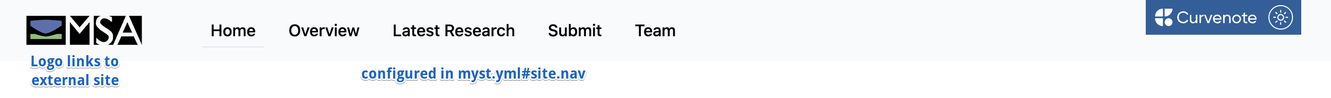 The landing site is written in MyST Markdown, giving you the ability to bring technical writing into any area of your venue and the means to add elements via Curvenote’s custom directives. The landing site’s page layout and navigation structure generally controls the page structure and navigation of the Venue (although parts of the navigation can be overridden / extended if needed).