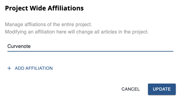 Author affiliations are saved to your project, so those can be edited or updated in a single place. You will see the “Edit Affiliations” button when adding a new author’s affiliations.