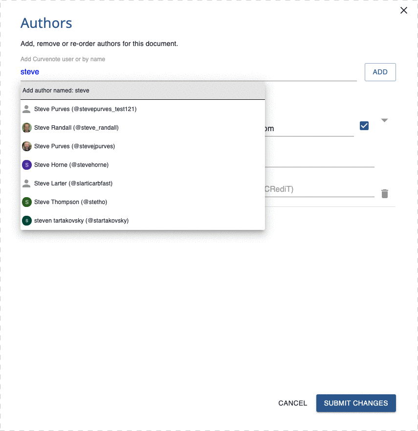 Search for authors by their user name or create them directly and add additional metadata. Edit the authors ORCID, corresponding email, affiliation(s), and the various contributor roles (CRediT Roles). These are used when building various PDF and Word exports across any template.