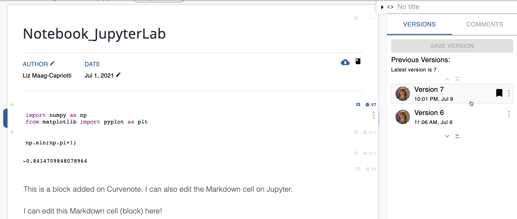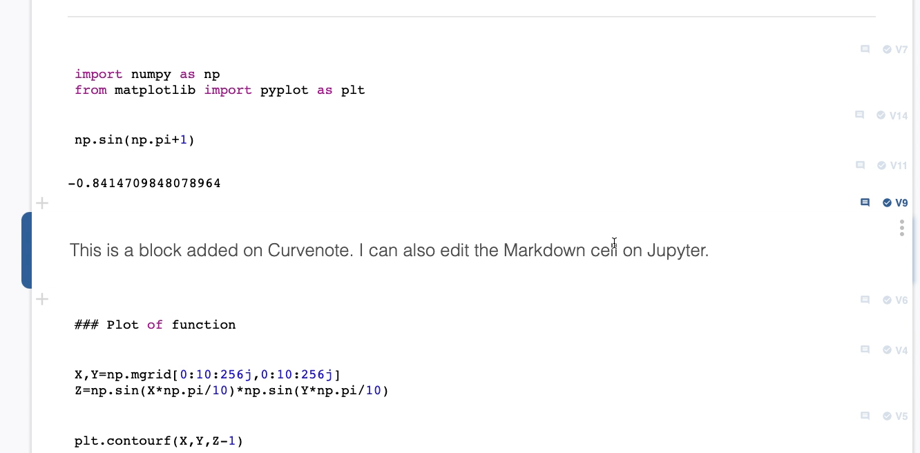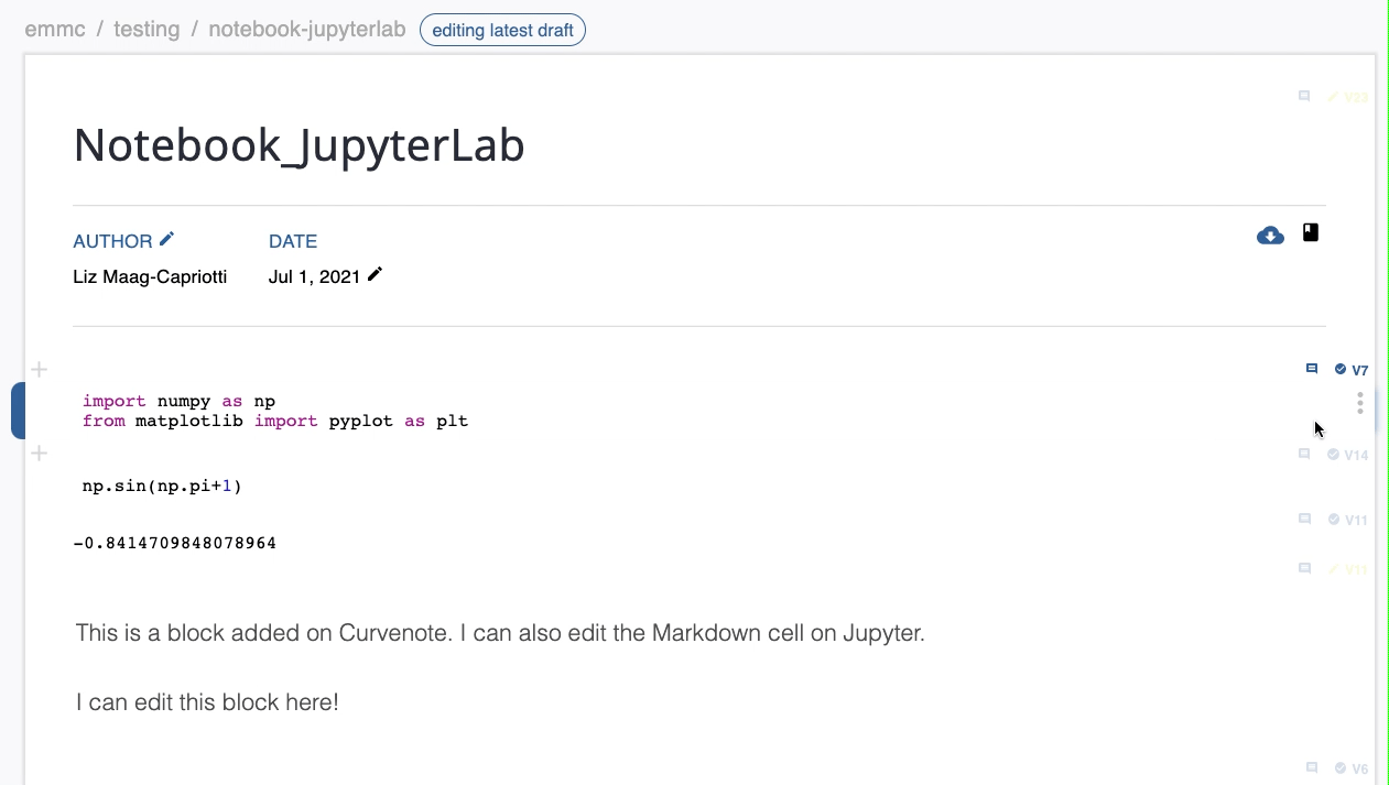Cells in Jupyter are blocks in Curvenote. When you access your notebook on Curvenote, you can enter draft mode to edit and save new versions of Markdown cells. You can also add blocks that will be considered Markdown cells when you open your notebook in Jupyter. On Curvenote you can view and use different versions of any type of cell and update the block settings.