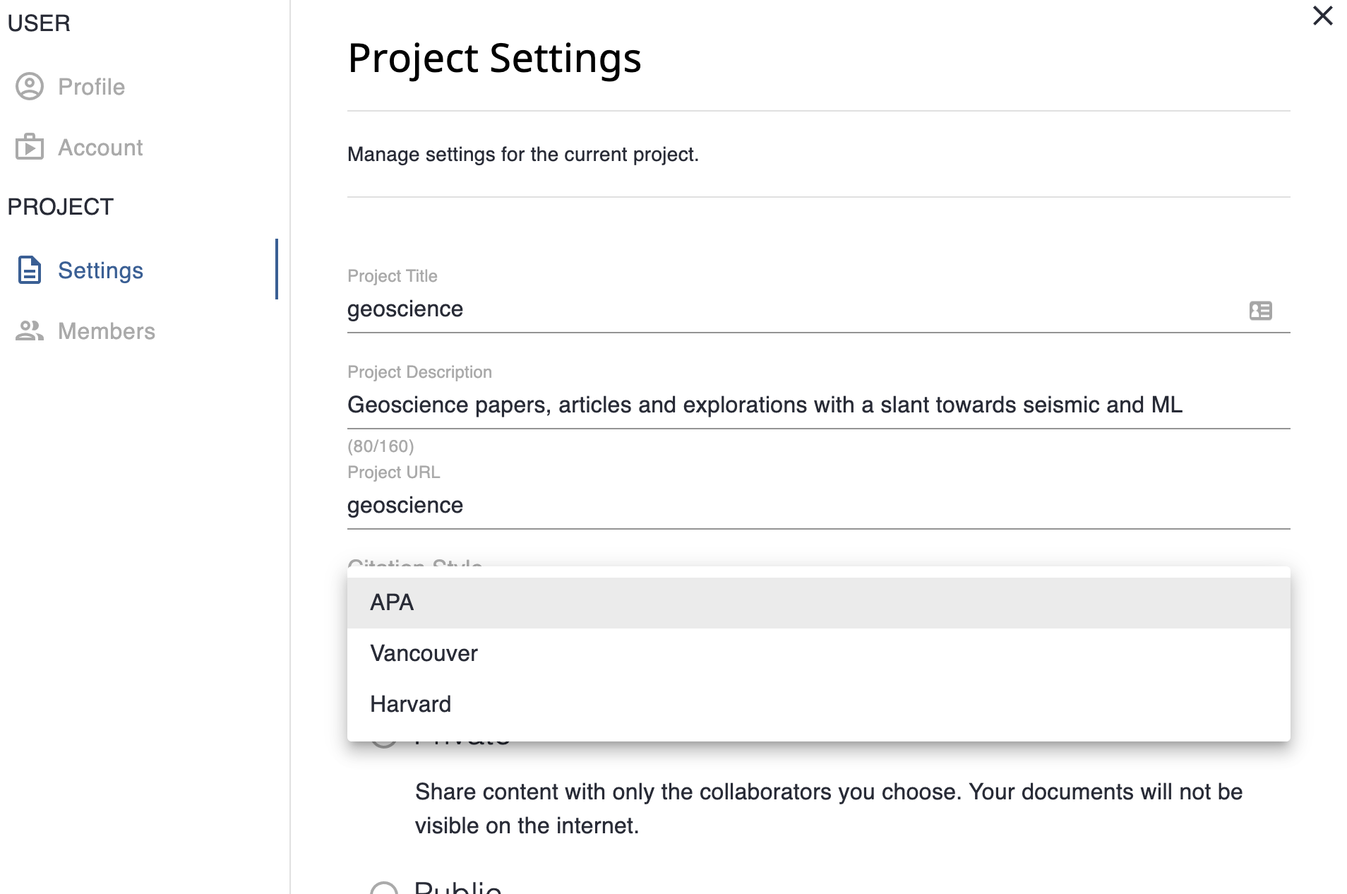 You can set the default citation style for your project the Project Settings. This citation style will be applied in the Curvenote app and in your exported files, except in LaTeX/PDF where the chosen template specifies its own citation and bibliography stying.