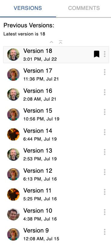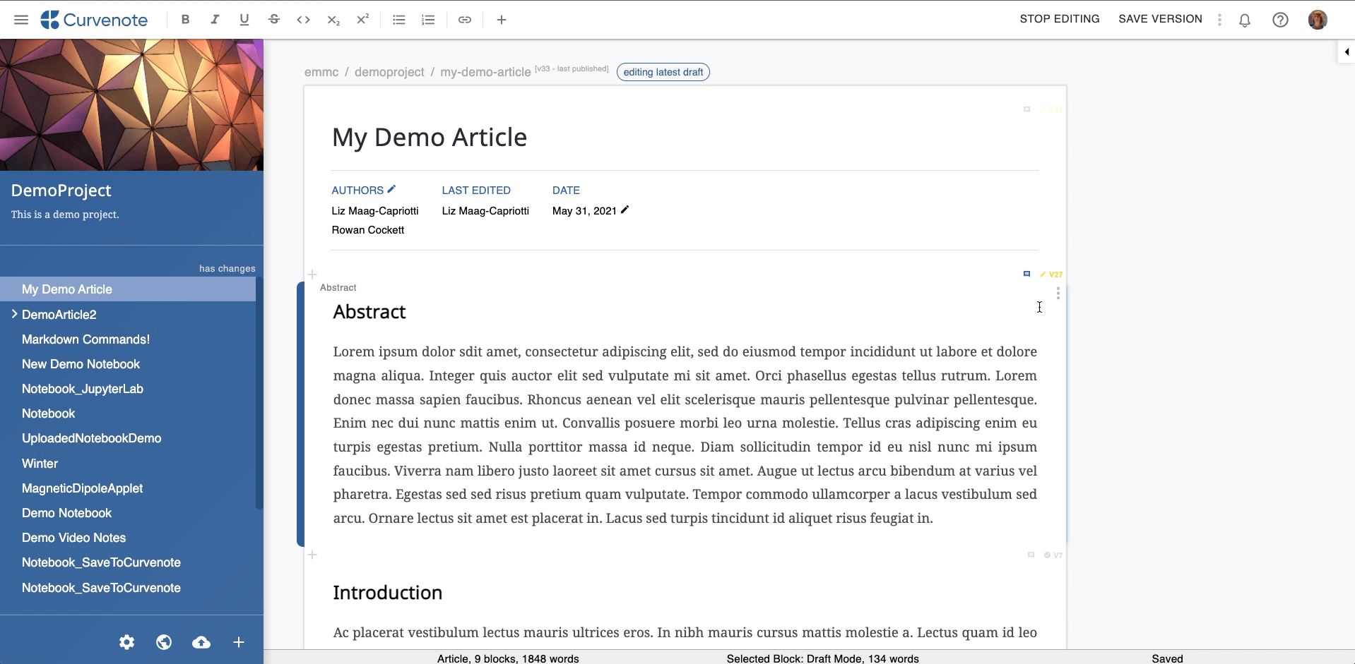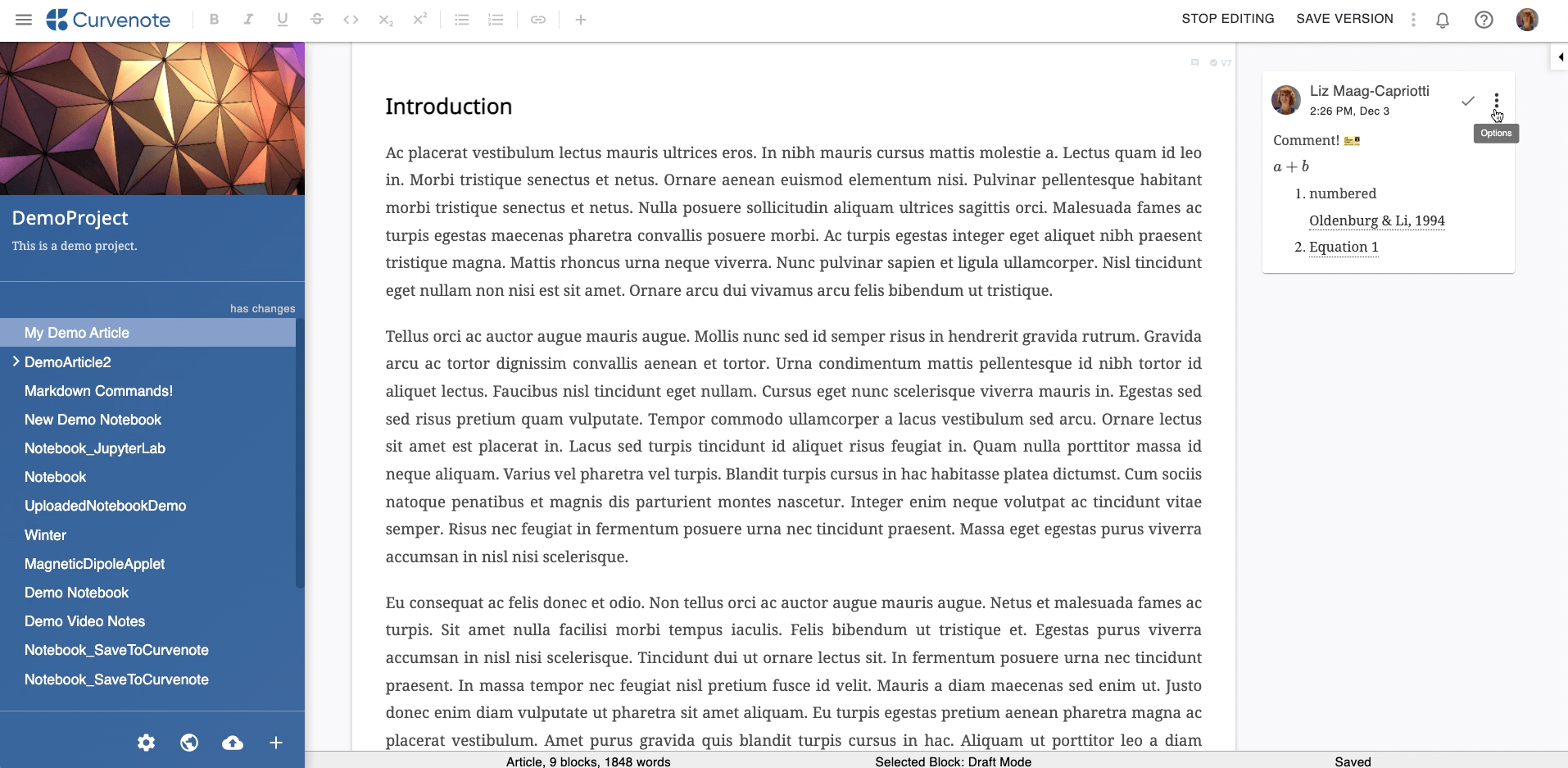 Each version of your article or block will indicate the collaborator who saved it and the date and time it was saved. These details are available in the Block Details Panel. You can hover over the collaborator’s profile image to see their Curvenote display name.
