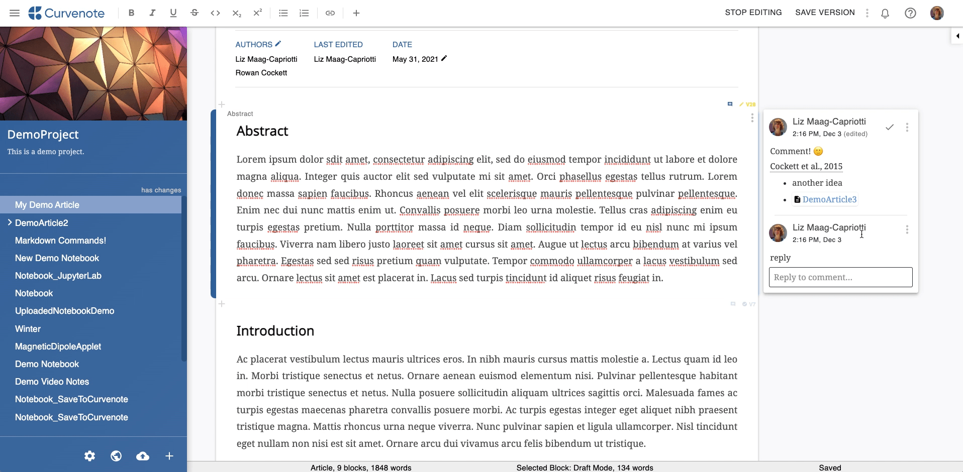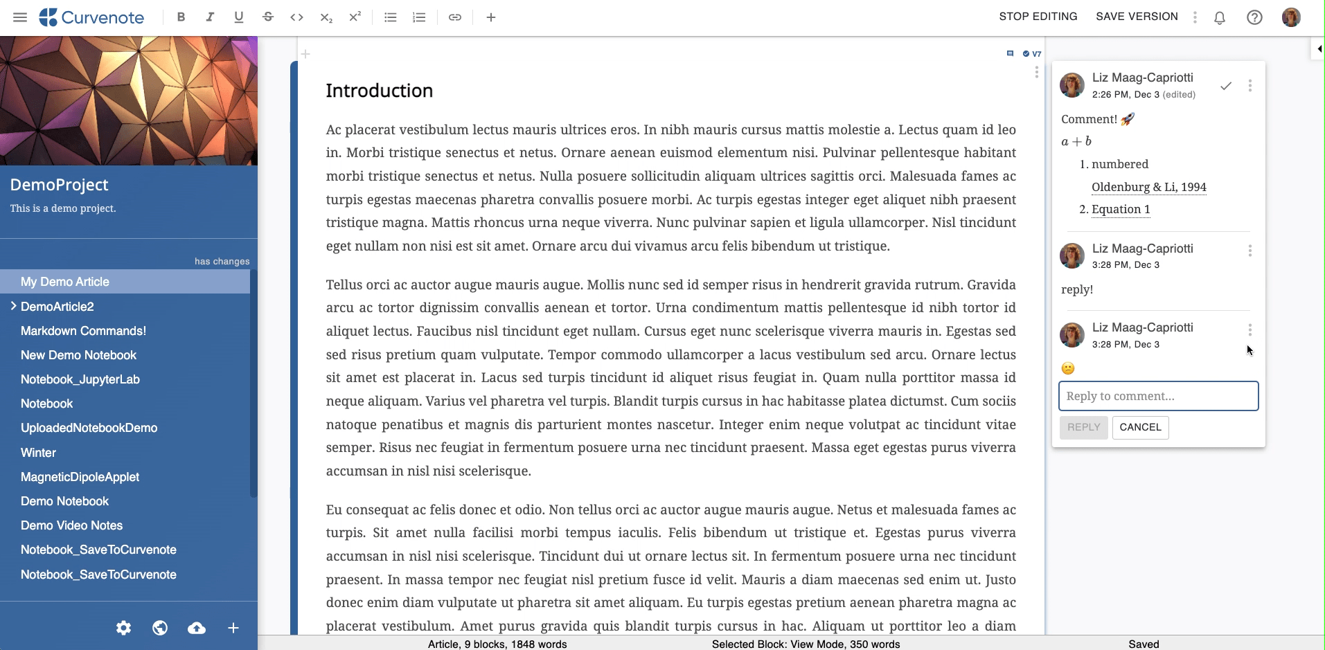 Collaborators can add comments throughout an article. Comments are attached to a specific block and can have replies, be resolved and/or reopened. Comments appear both to the right of the Editor and in the Block Details Panel.
