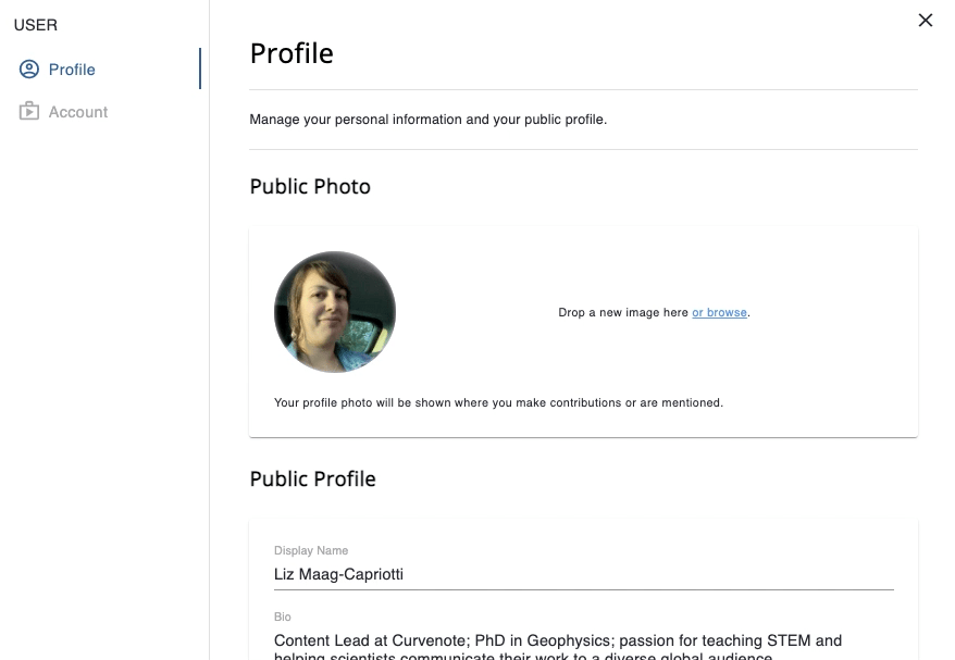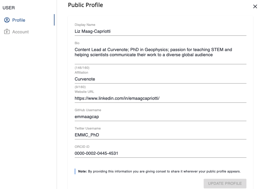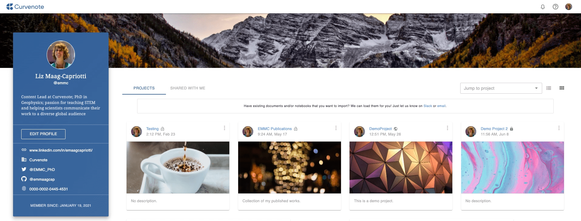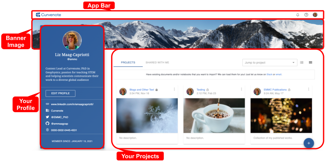 Once you log into Curvenote, you’ll be taken to your profile. On your profile, you’ll be able to view all the projects you’ve created, projects that are shared with you, and change your profile settings. Profiles are public and can be reached by anyone with your Curvenote username. Only your public projects are shown on your public profile.