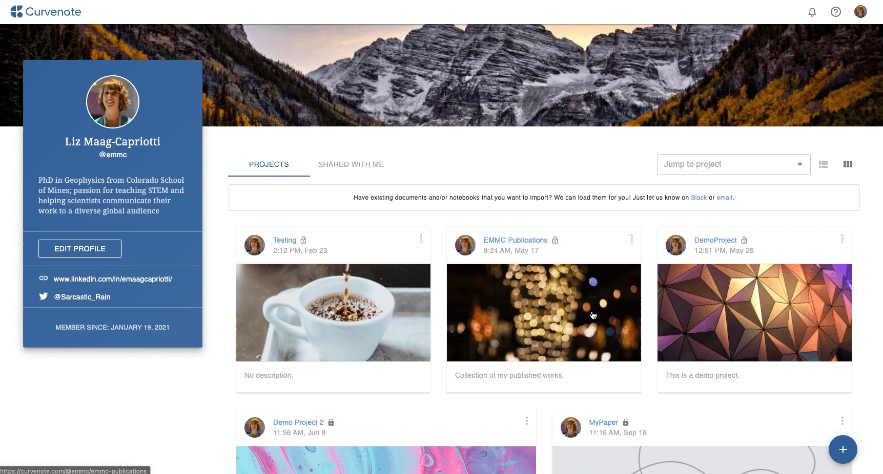 Content in Curvenote lives within projects, which are a collection of content (articles, notebooks, blocks) that belong to either you personally, or a team. Using projects allows you to organize your content, include collaborators, share and publish your content!