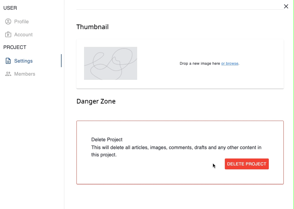 After creating a project you can update the settings at anytime. The project settings are accessible via the Project Actions menu when in your personal or team profile:
