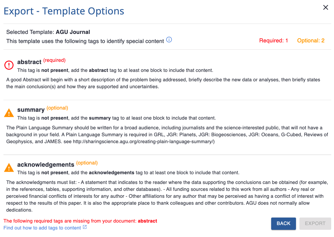 When you export an article from Curvenote, you can choose to use any of our professional templates. Templates may require special components exist within your manuscript such as an abstract, summary or acknowledgements. Curvenote uses tags to indicate what within your article is considered to be these special components. When you initiate an export of your article, Curvenote will check that the required tags exist for that particular template.
