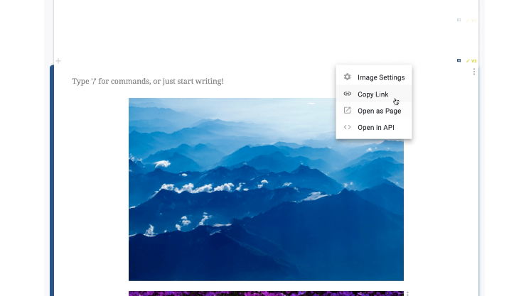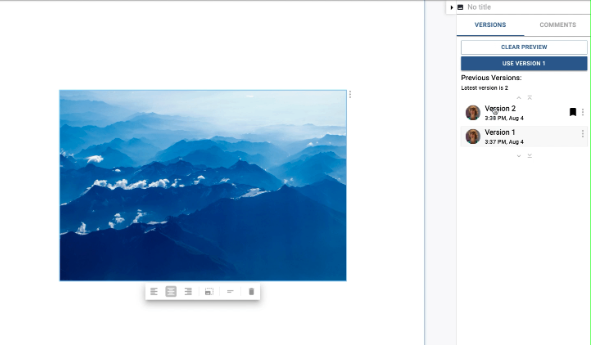 No matter if your image/GIF is displayed as its own block or within another block, it is versioned independently. New versions are created when you replace the image or update the image caption. When the image/GIF is selected, you can access the previous versions and choose to use them as you would a block, in the Block Details Panel.