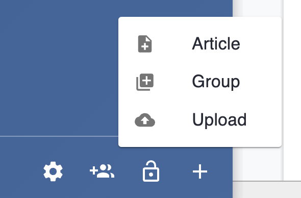 When you hover over a navigation item, a shortcut is shown to create a new article directly underneath an existing navigation item or edit the settings of that document. If the item is a group, then you will be able to edit the group title or delete the group through the edit modal.