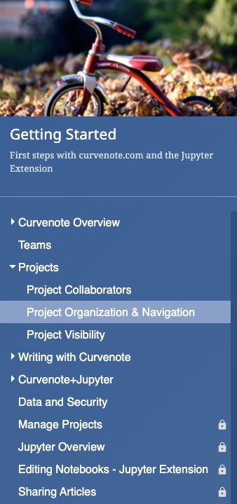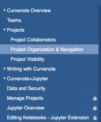 The project sidebar helps with organizing all of the documents in your project. You, collaborators, and public viewers can navigate through your project’s content in variety of ways.
