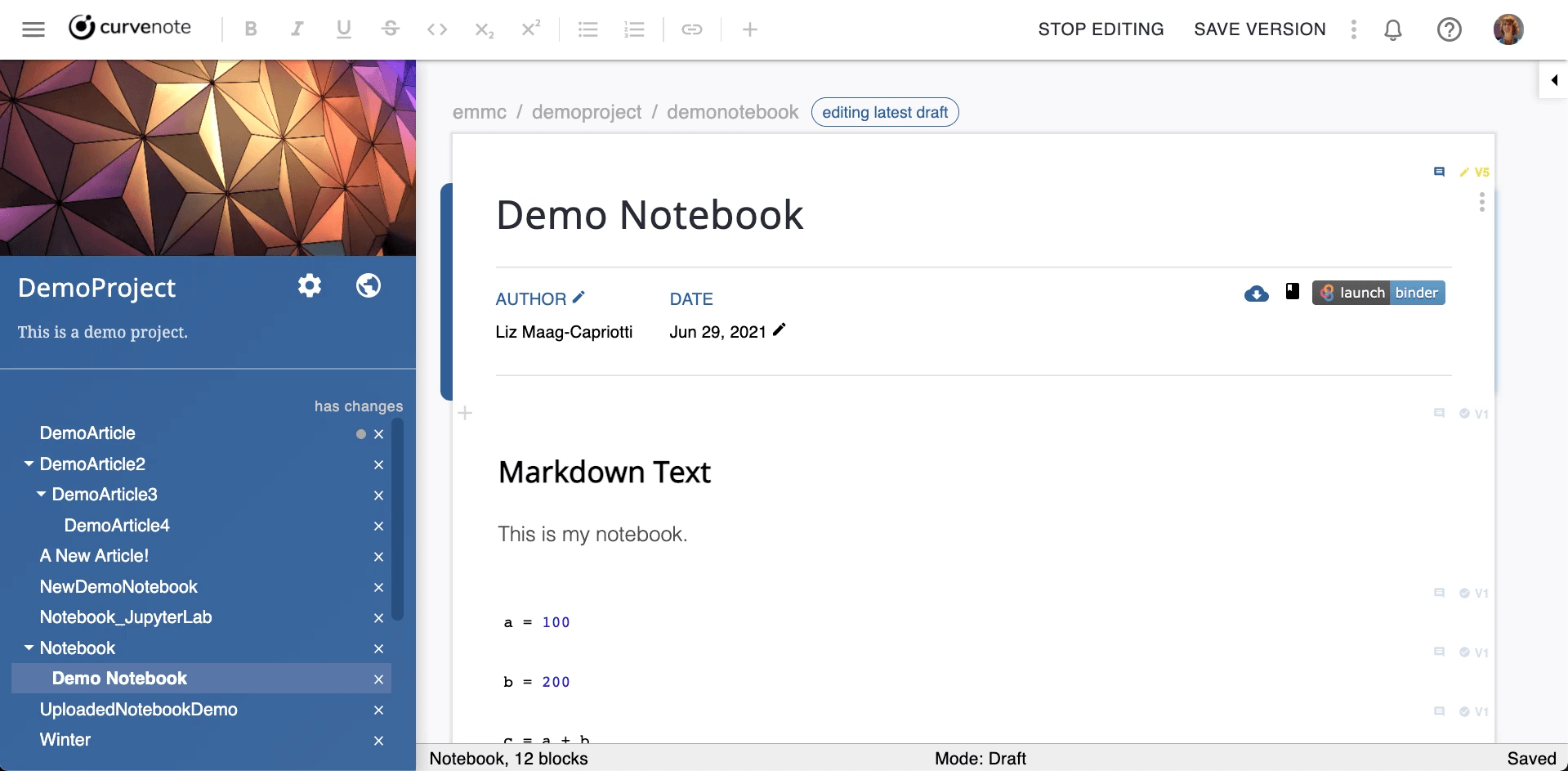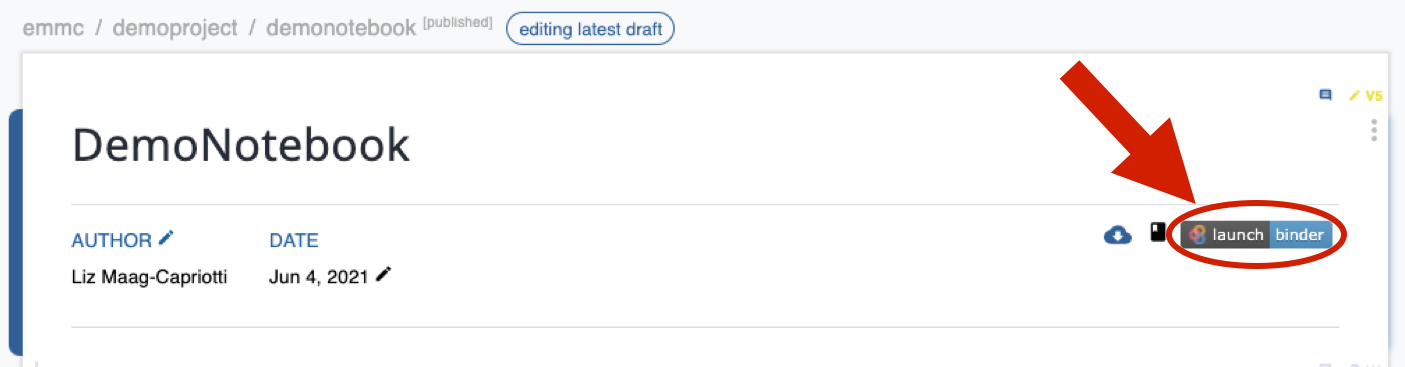 Adding a Binder URL will add a Launch Binder button to the top right of your notebook when viewed in the Curvenote editor. Removing the URL will remove the button. Learn more about Binder + Curvenote Curvenote & Binder.