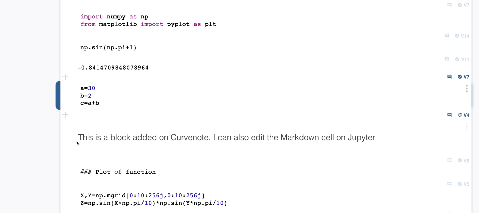 When a notebook is added to Curvenote, each of the cells are considered blocks and have a unique oxa link. These links correspond to a specific version number of the block and allow you to reuse your content throughout Curvenote. All copies of a block are linked so you can easily view, edit, and access all previous versions of the block from any copy. Reusing Jupyter cells is a convenient and simple way to integrate your static or interactive code outputs directly into your writing, use prewritten code as a template for new projects, and more!