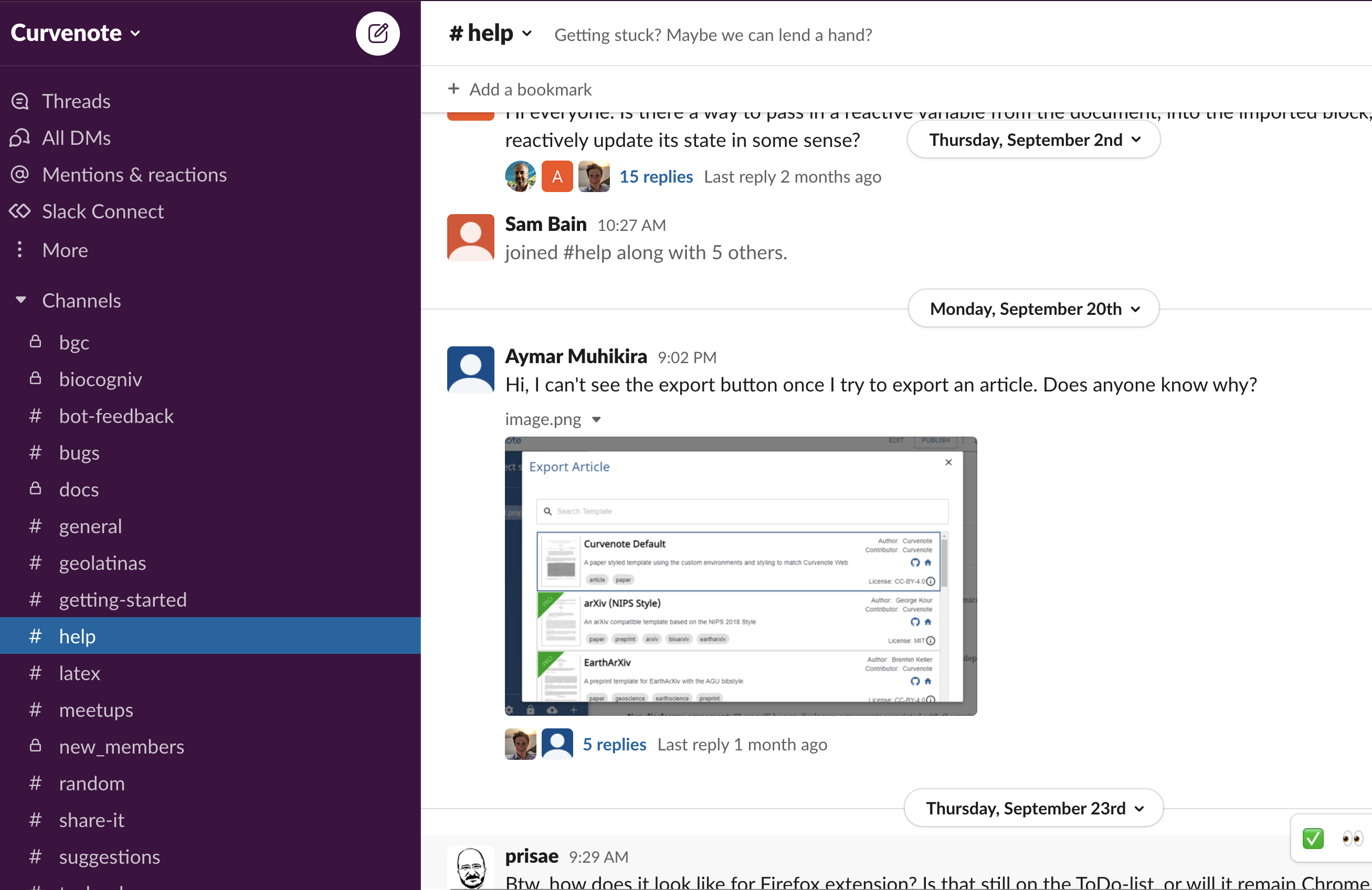 Curvenote has a Community Slack Team which is a great place to get help, support, find other Curvenote users and stay up to date with the latest release information and give input on what is getting developed.