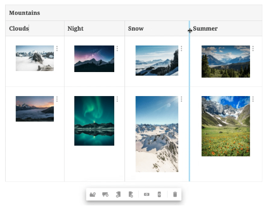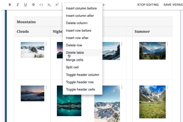 Tables can be deleted while in edit mode for both your article and block. To delete a table: