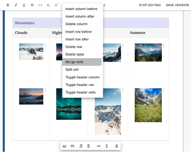 Cells within a table can be merged. Cells that were previously merged can be split.