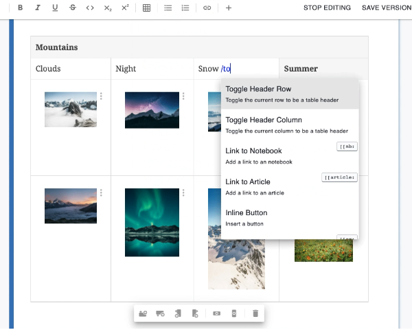 While in Draft Mode for both your article and block, add a table using one of the following options: