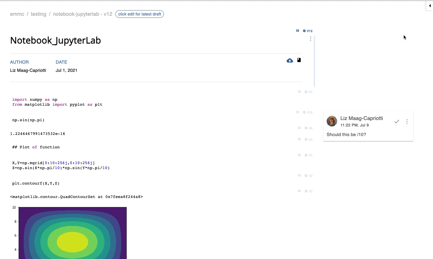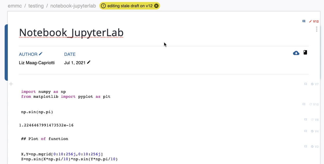 Curvenote provides versioning for your notebooks and their individual cells. When you add a notebook to Curvenote the version numbering for the notebook as a whole begins at one (the cells are also versioned individually as blocks, learn more Blocks & Cells). You and your collaborators can then make changes and save new versions of your notebook. You can preview and use previous versions on Curvenote.