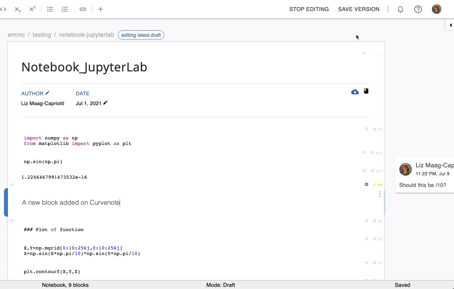 To make changes to your notebook on Curvenote, requires you to be in Draft Mode, which is indicated by the yellow ✏️ and version number to the right of the notebook title. You may only edit the most recent saved version of your notebook on Curvenote. Curvenote cannot currently run code cells. You can edit Markdown cells on Curvenote, and any new blocks added will be consider Markdown cells when they are opened in Jupyter. Learn more about editing your notebooks in Curvenote ➡️ Curvenote+Jupyter